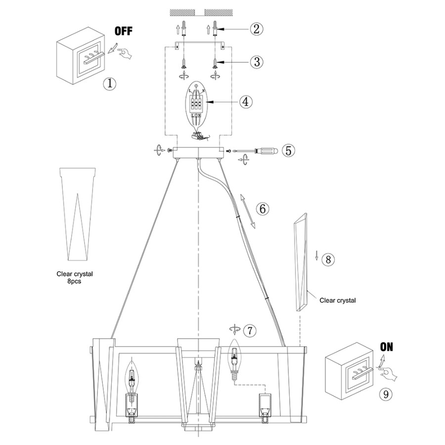 Конструкция светильника предусматривает применение 8 ламп с цоколем E14, общая мощность 320 Вт, что позволяет осветить 23 м2.