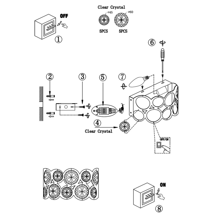 Конструкция светильника предусматривает применение 2 ламп с цоколем E14, общая мощность 80 Вт, что позволяет осветить 6 м2.