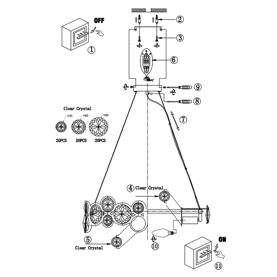 Конструкция светильника предусматривает применение 6 ламп с цоколем E14, общая мощность 240 Вт, что позволяет осветить 18 м2.
