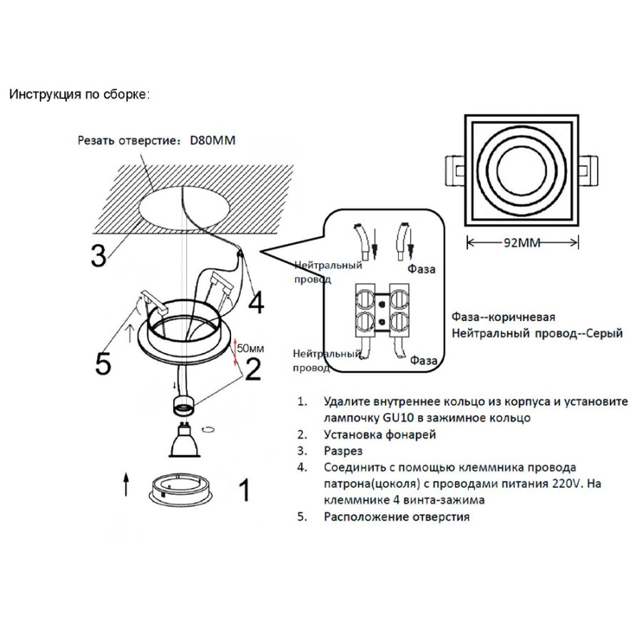 Конструкция светильника предусматривает применение 1 лампы с цоколем GU10, общая мощность 50 Вт.