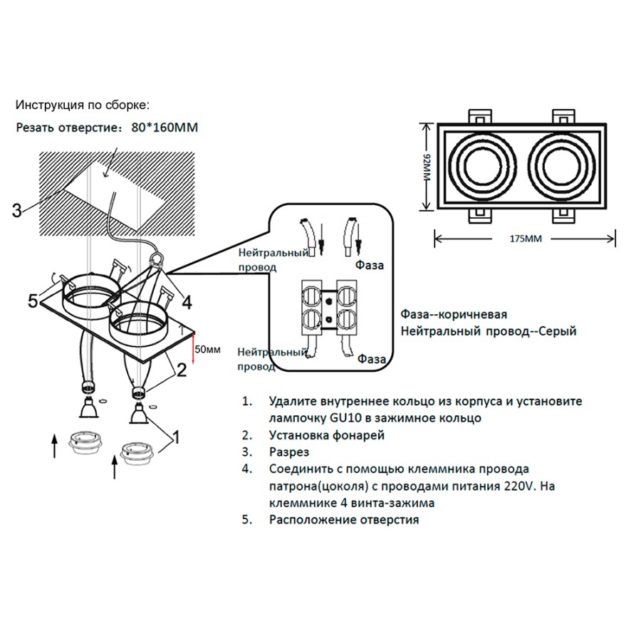 Конструкция светильника предусматривает применение 2 ламп с цоколем GU10, общая мощность 100 Вт.