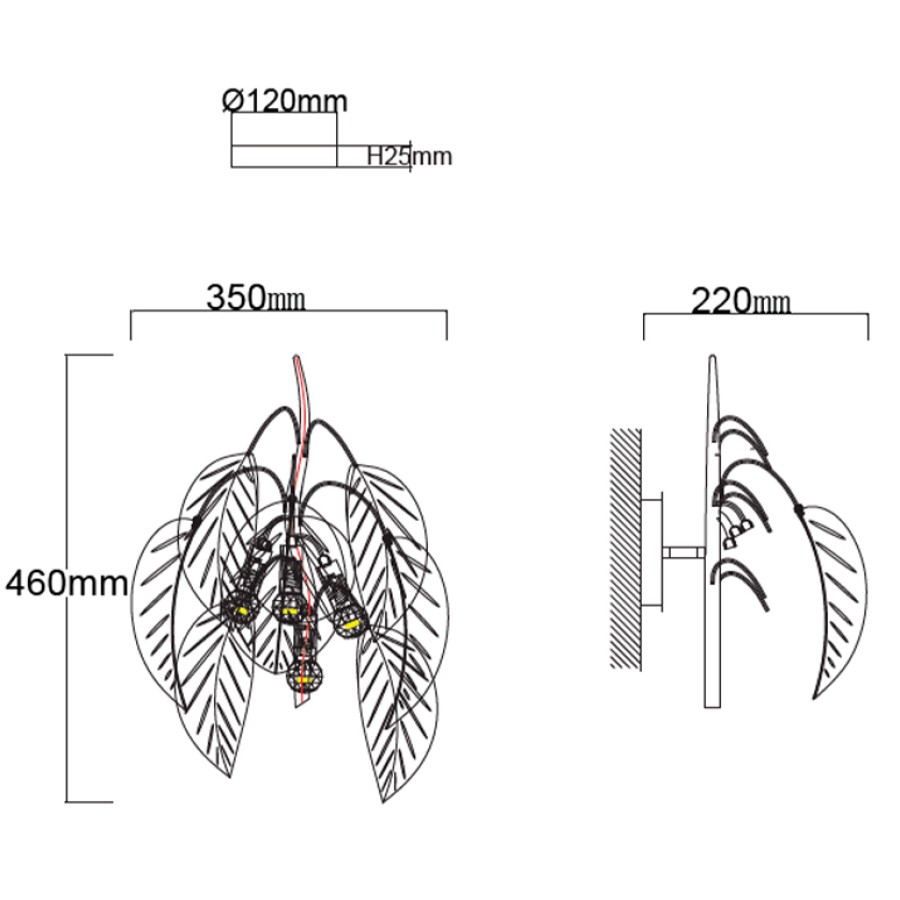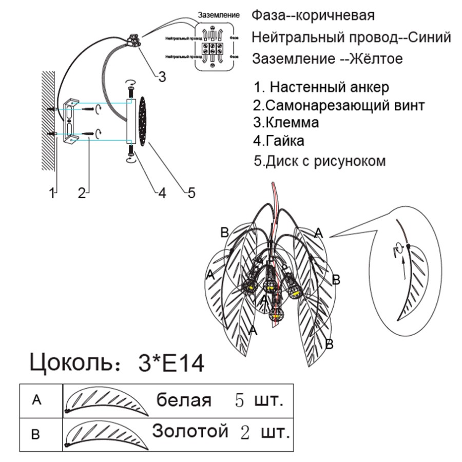Конструкция светильника предусматривает применение 3 ламп с цоколем E14, общая мощность 120 Вт, что позволяет осветить 9 м2.