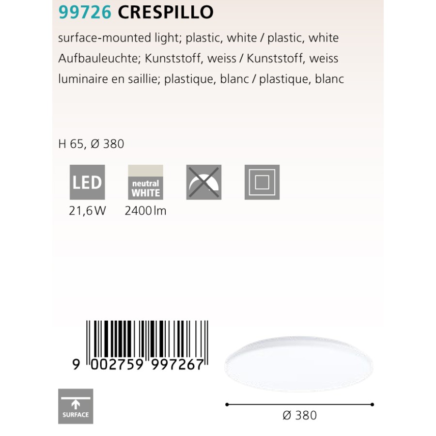Модель Eglo Crespillo 99726 обладает мощностью 21.6 Вт и может осветить 10 м2, цветовая температура - 4000k (нейтральный белый). Лампочки входят в комплект поставки. Интернет-магазин Обстановка.ру предлагает купить освещение Eglo 99726 по цене 7490 руб. с доставкой по Москве и всей России.