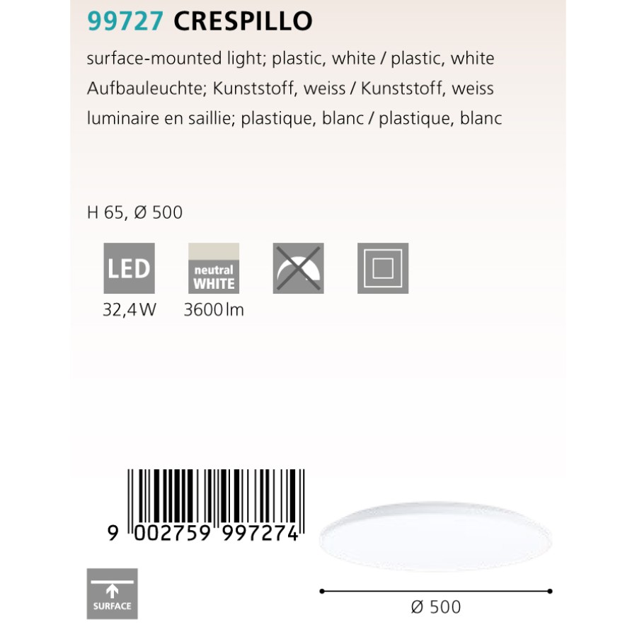Модель Eglo Crespillo 99727 обладает мощностью 32.4 Вт и может осветить 14 м2, цветовая температура - 4000k (нейтральный белый). Лампочки входят в комплект поставки. Интернет-магазин Обстановка.ру предлагает купить освещение Eglo 99727 по цене 9190 руб. с доставкой по Москве и всей России.