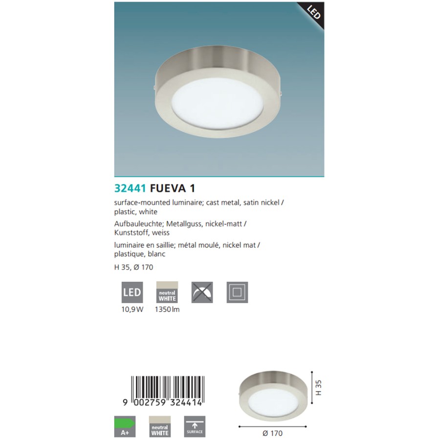 Модель Eglo Fueva 1 32441 обладает мощностью 10.9 Вт и может осветить 5 м2, цветовая температура - 4000k (нейтральный белый). Лампочки входят в комплект поставки. Интернет-магазин Обстановка.ру предлагает купить освещение Eglo 32441 по цене 3390 руб. с доставкой по Москве и всей России.