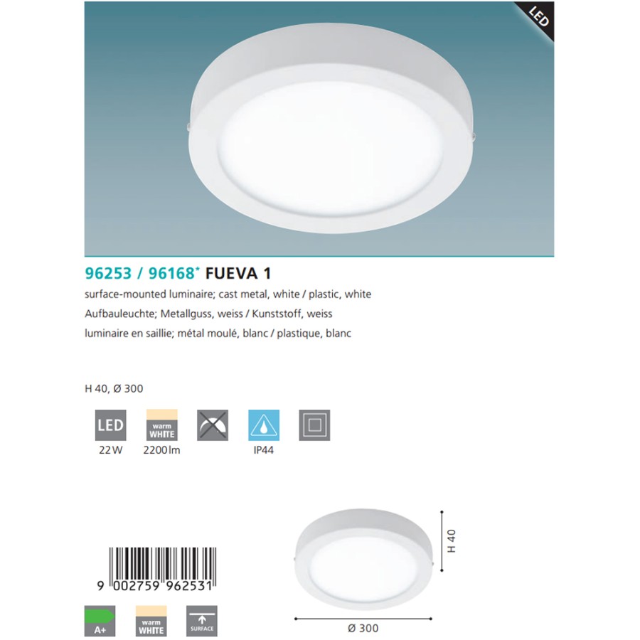 Модель Eglo Fueva 1 96168 обладает мощностью 22 Вт и может осветить 10 м2, цветовая температура - теплый белый (теплый как лампа накаливания). Лампочки входят в комплект поставки. Интернет-магазин Обстановка.ру предлагает купить освещение Eglo 96168 по цене 12238 руб. с доставкой по Москве и всей России.