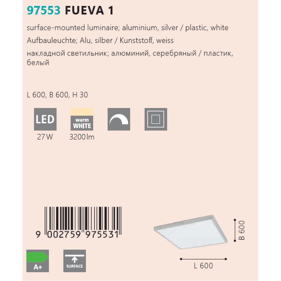 Модель Eglo Fueva 1 97553 обладает мощностью 27 Вт и может осветить 12 м2, цветовая температура - 3000k (теплый как лампа накаливания). Лампочки входят в комплект поставки. Интернет-магазин Обстановка.ру предлагает купить освещение Eglo 97553 по цене 15290 руб. с доставкой по Москве и всей России.