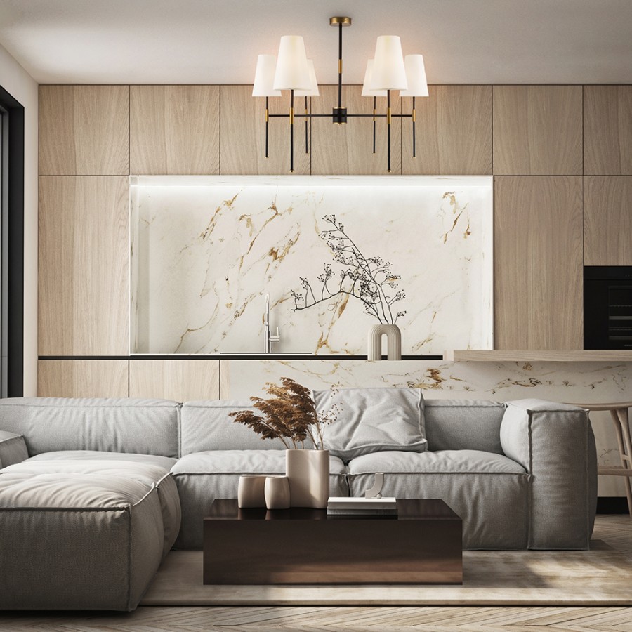 Конструкция светильника предусматривает применение 6 ламп с цоколем E14, общая мощность 240 Вт, что позволяет осветить 18 м2.