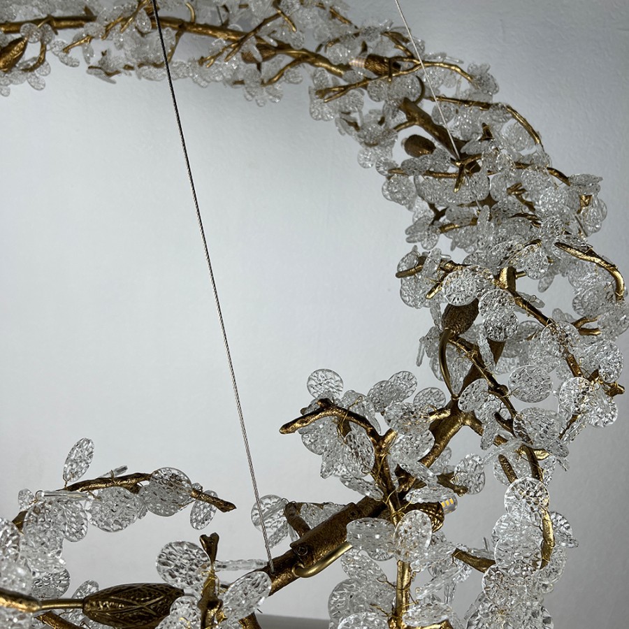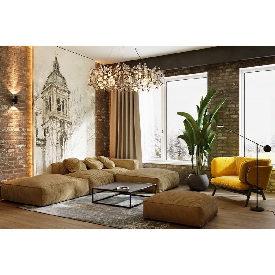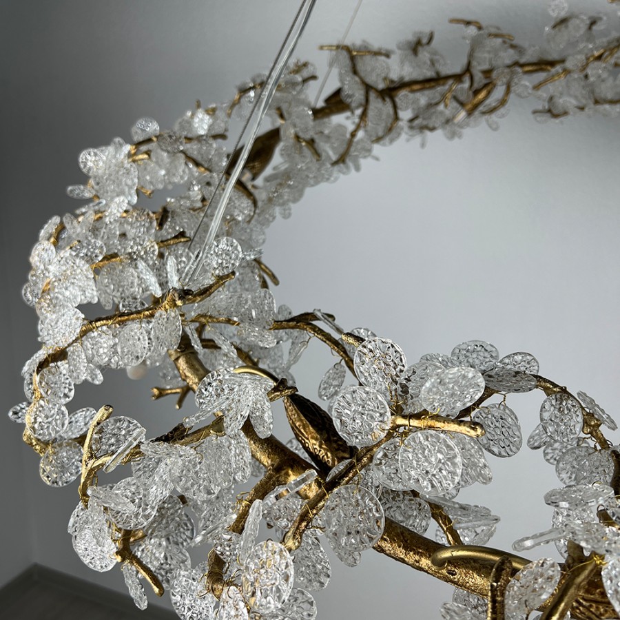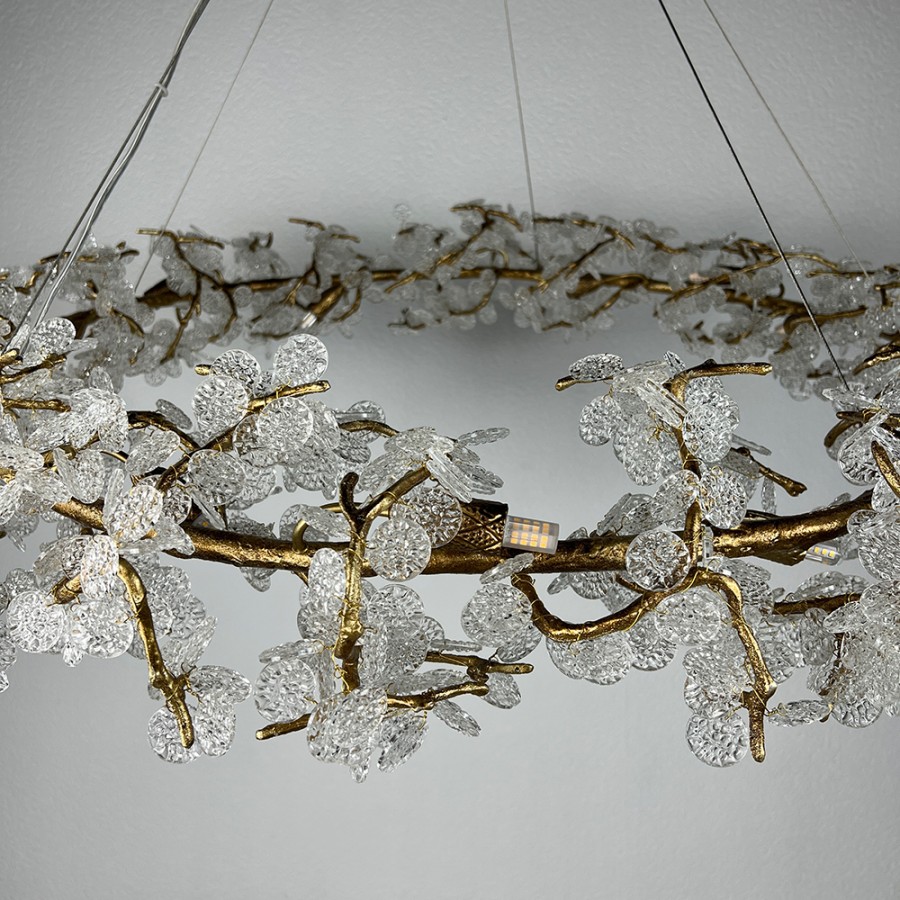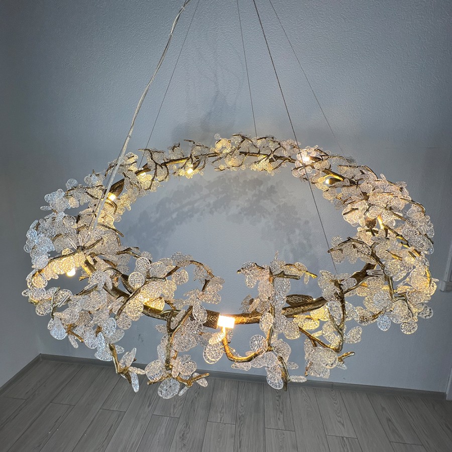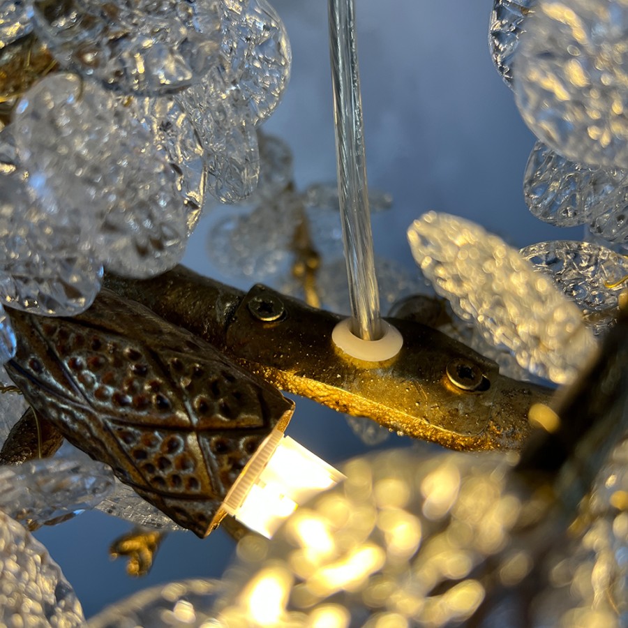 Конструкция светильника предусматривает применение 15 ламп с цоколем G9, общая мощность 600 Вт, что позволяет осветить 35 м2.