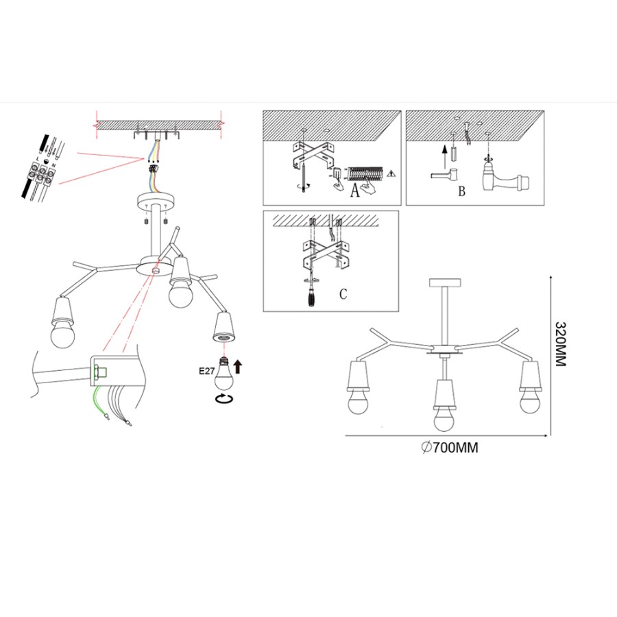 Конструкция светильника предусматривает применение 3 ламп с цоколем E27, общая мощность 180 Вт, что позволяет осветить 13 м2.