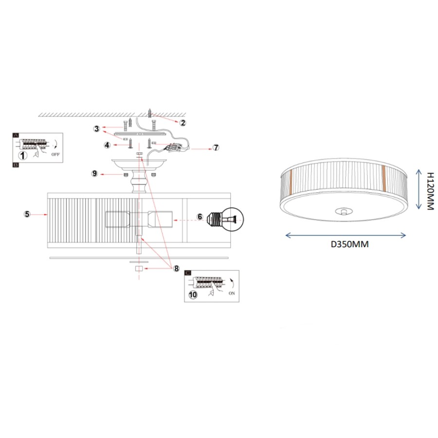Конструкция светильника предусматривает применение 3 ламп с цоколем E14, общая мощность 120 Вт, что позволяет осветить 9 м2.