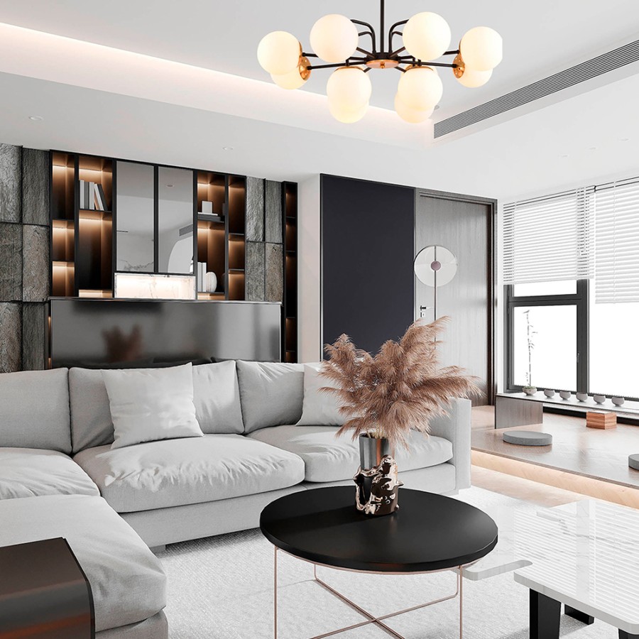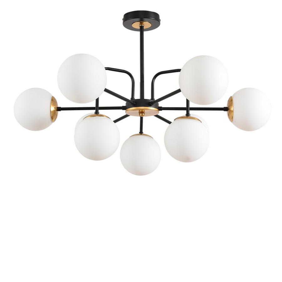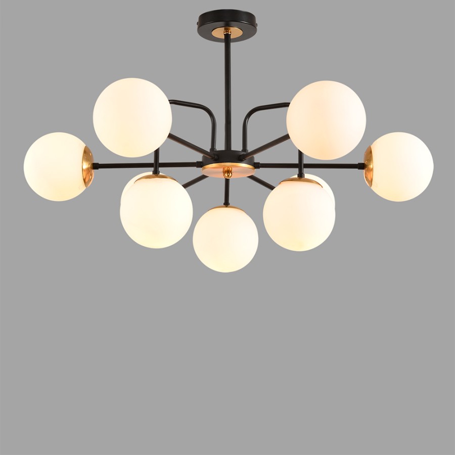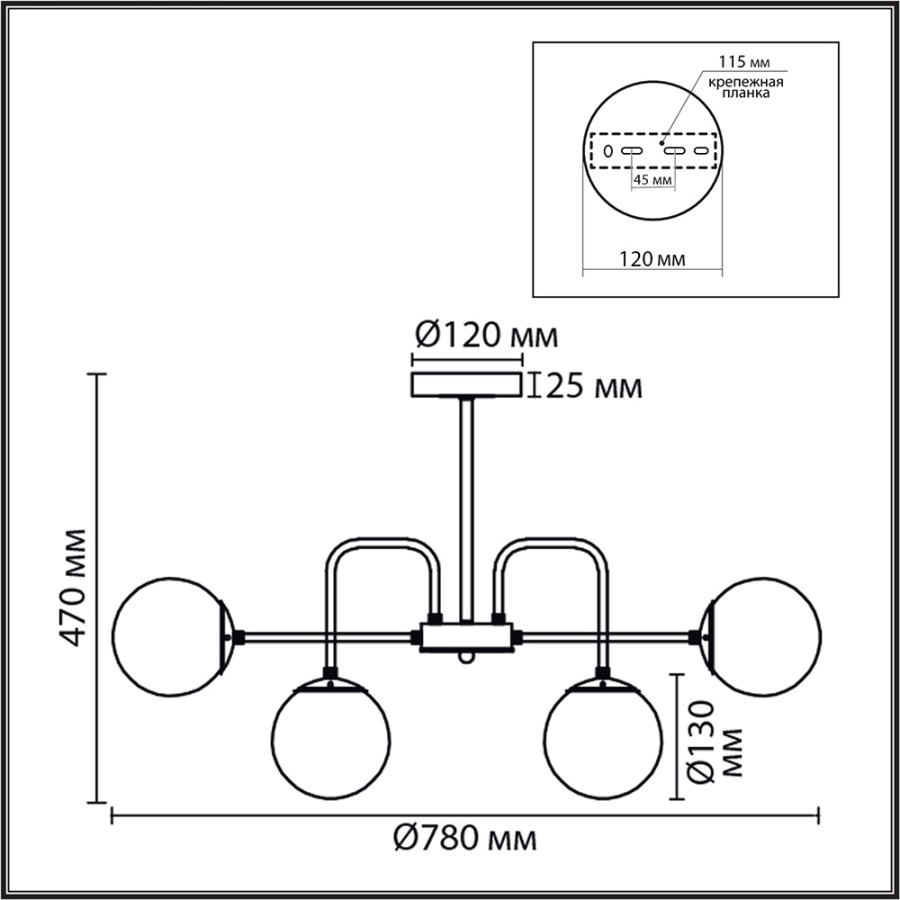 Конструкция светильника предусматривает применение 9 ламп с цоколем E27, общая мощность 540 Вт, что позволяет осветить 35 м2.