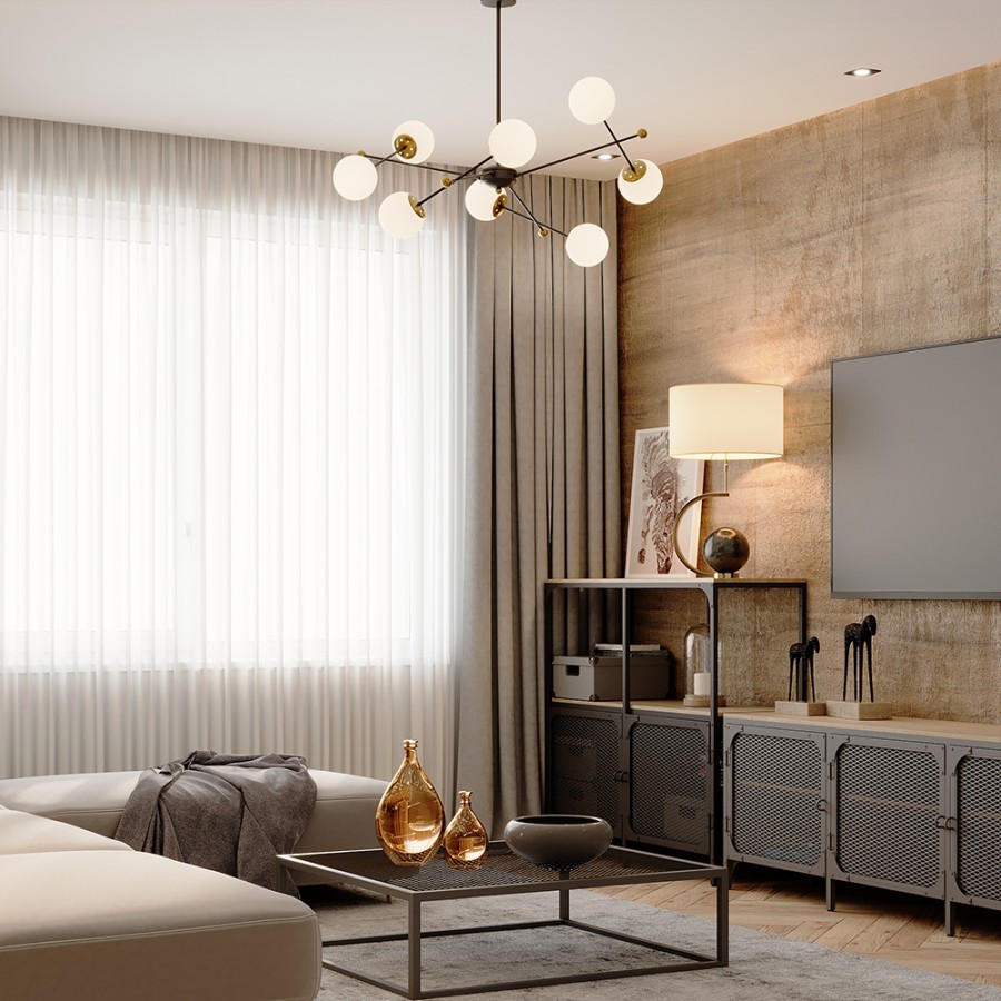 Конструкция светильника предусматривает применение 8 ламп с цоколем E14, общая мощность 320 Вт, что позволяет осветить 23 м2.