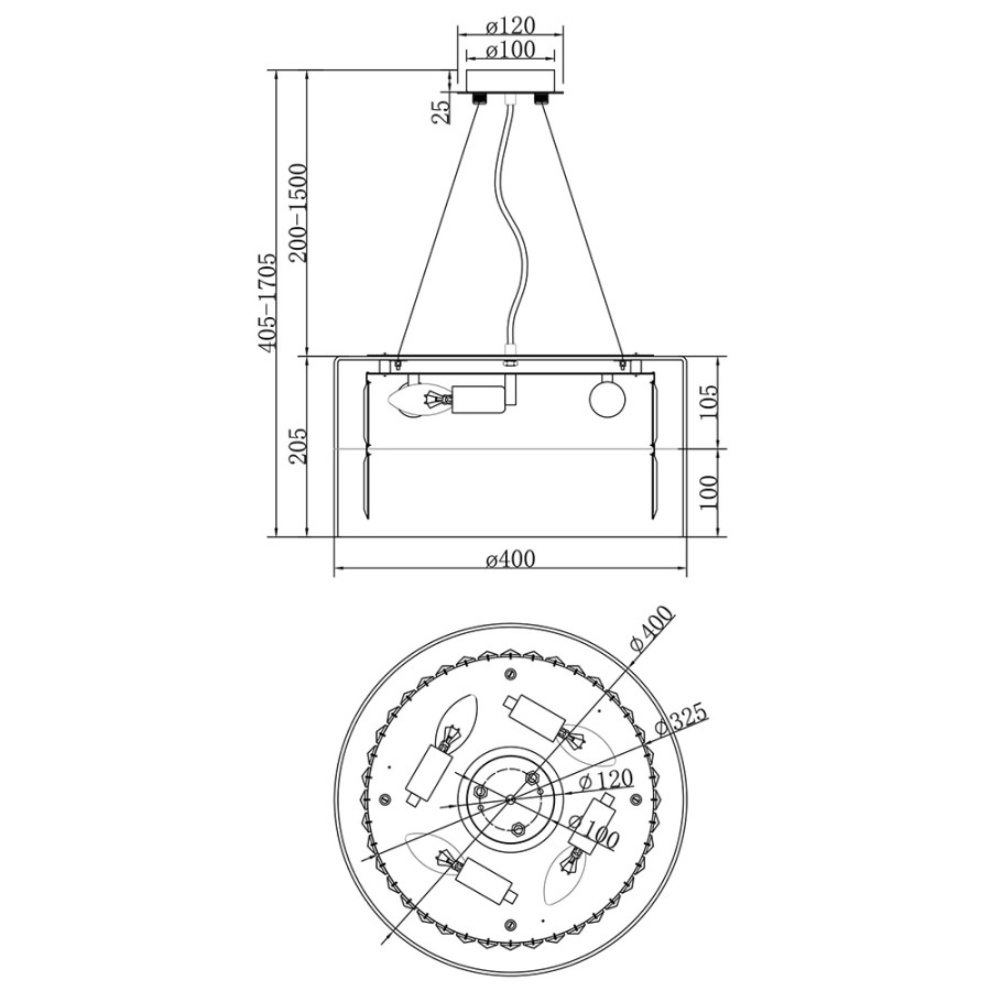 Конструкция светильника предусматривает применение 4 ламп с цоколем E14, общая мощность 240 Вт, что позволяет осветить 18 м2.