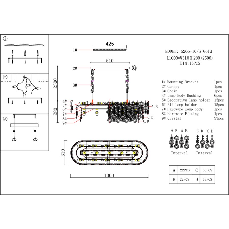 Конструкция светильника предусматривает применение 15 ламп с цоколем E14, общая мощность 600 Вт, что позволяет осветить 35 м2.