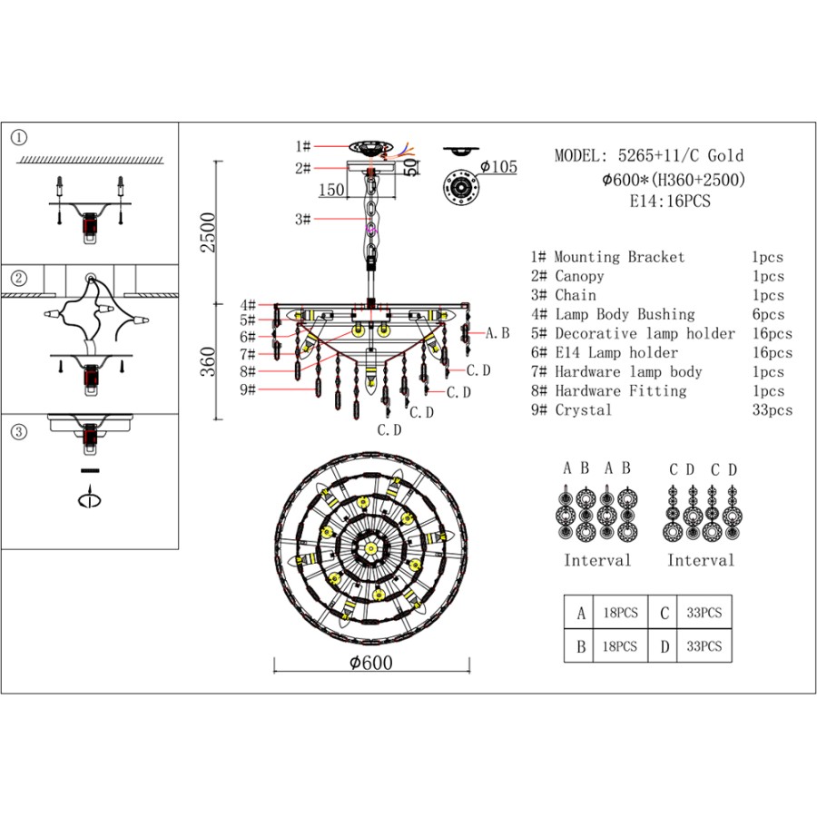 Конструкция светильника предусматривает применение 16 ламп с цоколем E14, общая мощность 640 Вт, что позволяет осветить 35 м2.