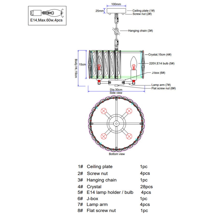 Конструкция светильника предусматривает применение 4 ламп с цоколем E14, общая мощность 240 Вт, что позволяет осветить 18 м2.