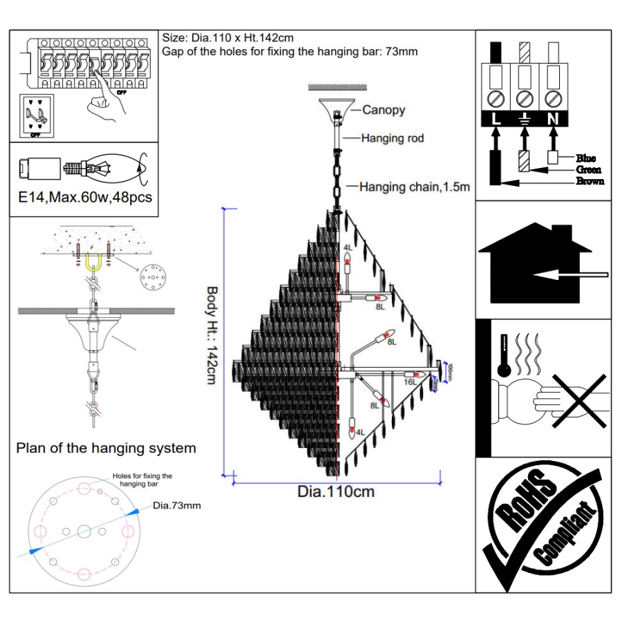 Конструкция светильника предусматривает применение 48 ламп с цоколем E14, общая мощность 2880 Вт, что позволяет осветить 35 м2.