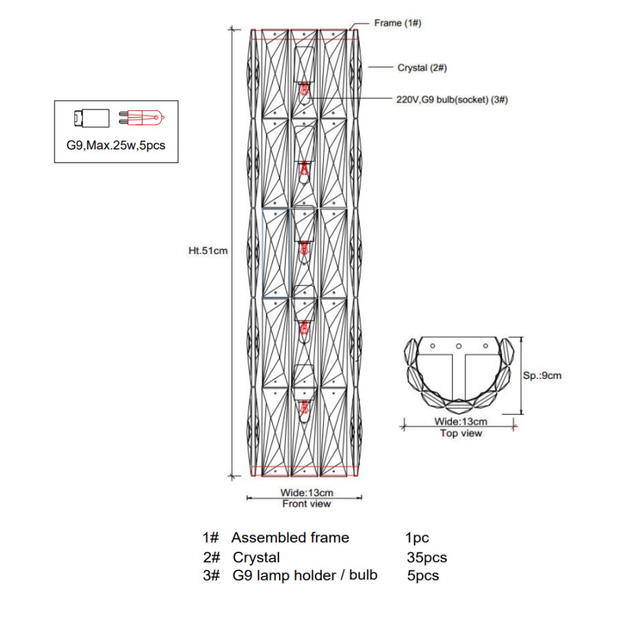 Конструкция светильника предусматривает применение 5 ламп с цоколем G9, общая мощность 225 Вт, что позволяет осветить 17 м2.