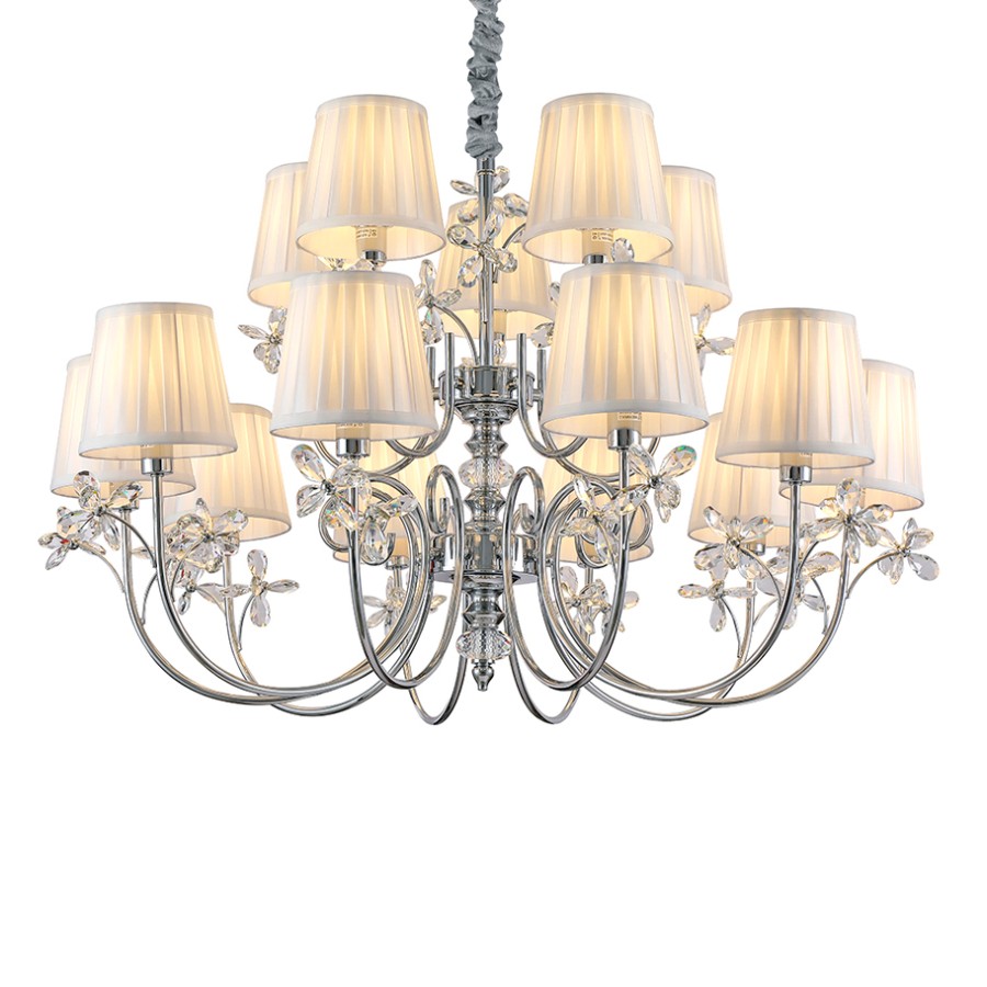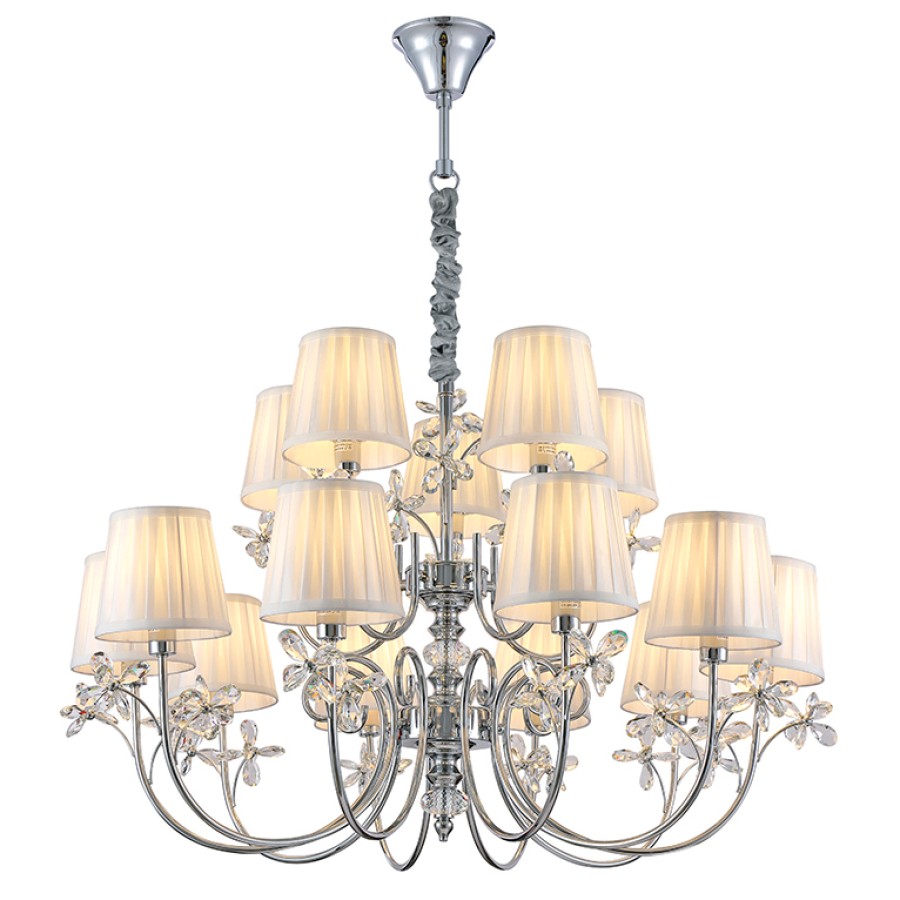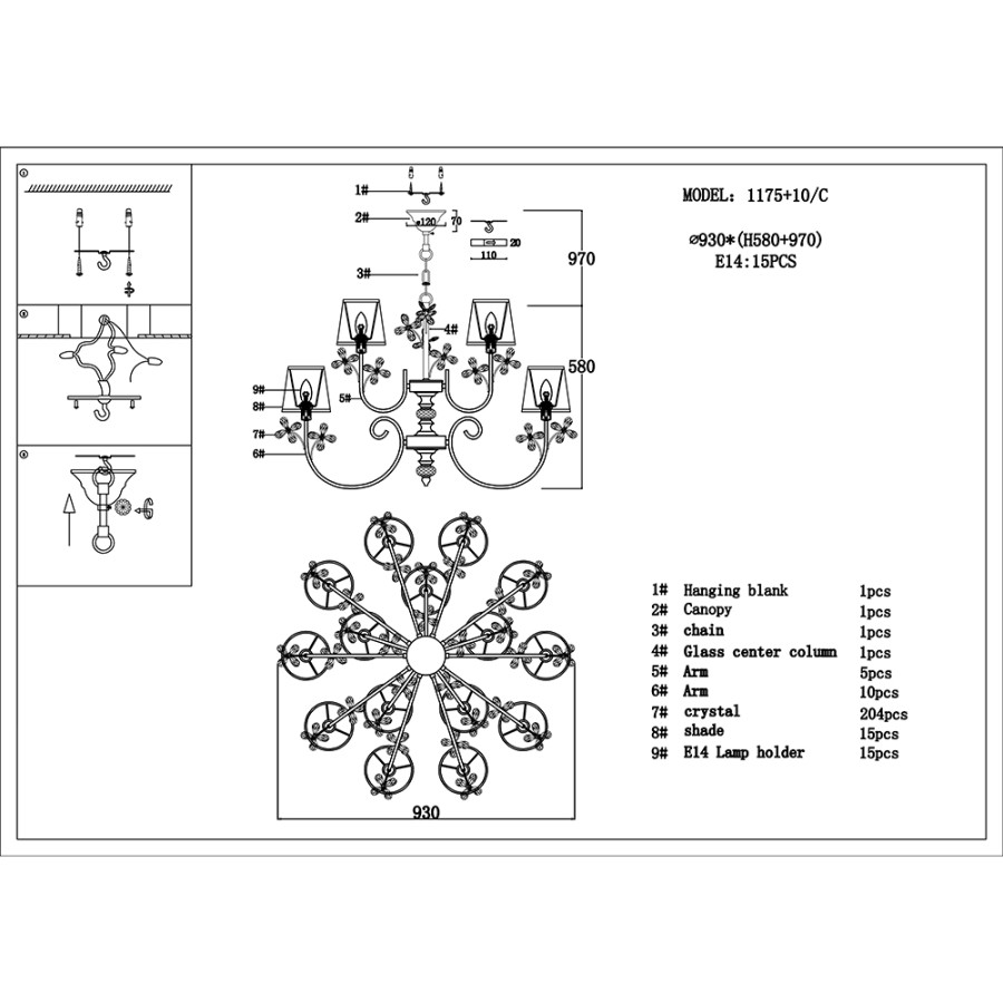 Конструкция светильника предусматривает применение 15 ламп с цоколем E14, общая мощность 900 Вт, что позволяет осветить 35 м2.