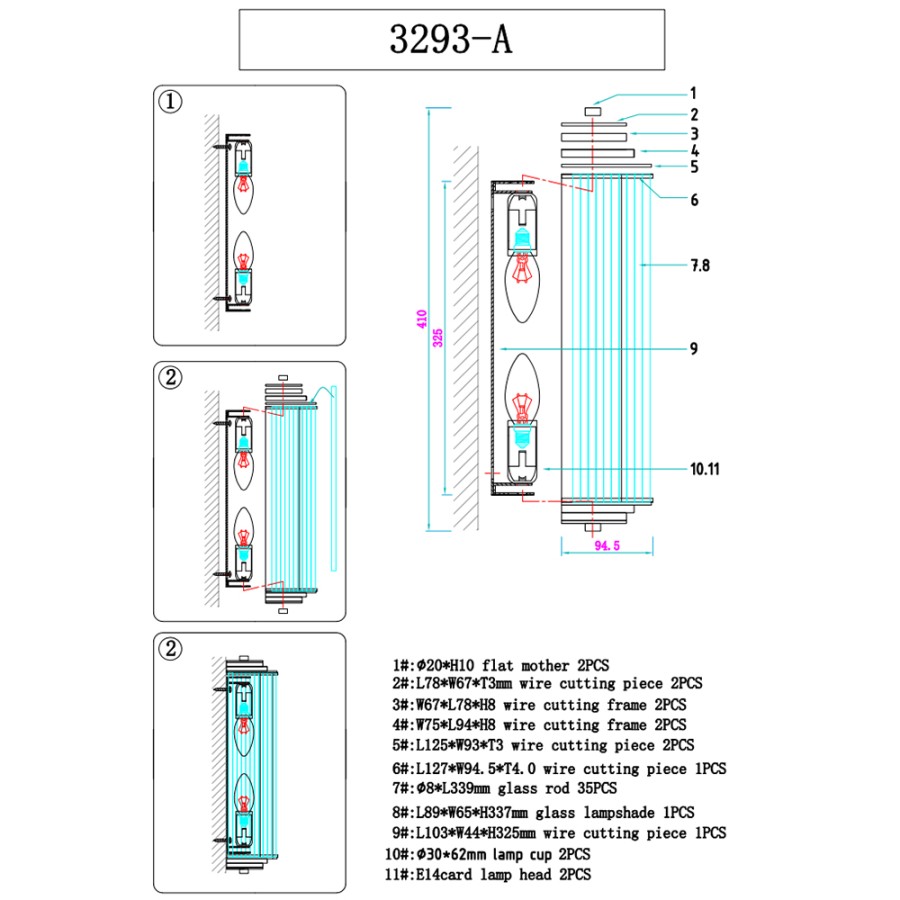 Конструкция светильника предусматривает применение 2 ламп с цоколем E14, общая мощность 80 Вт, что позволяет осветить 6 м2.