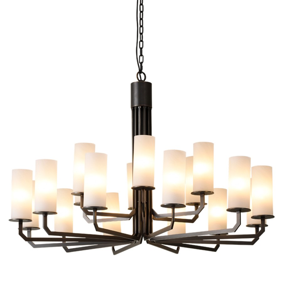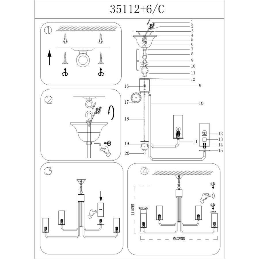 Конструкция светильника предусматривает применение 18 ламп с цоколем E14, общая мощность 1080 Вт, что позволяет осветить 35 м2.