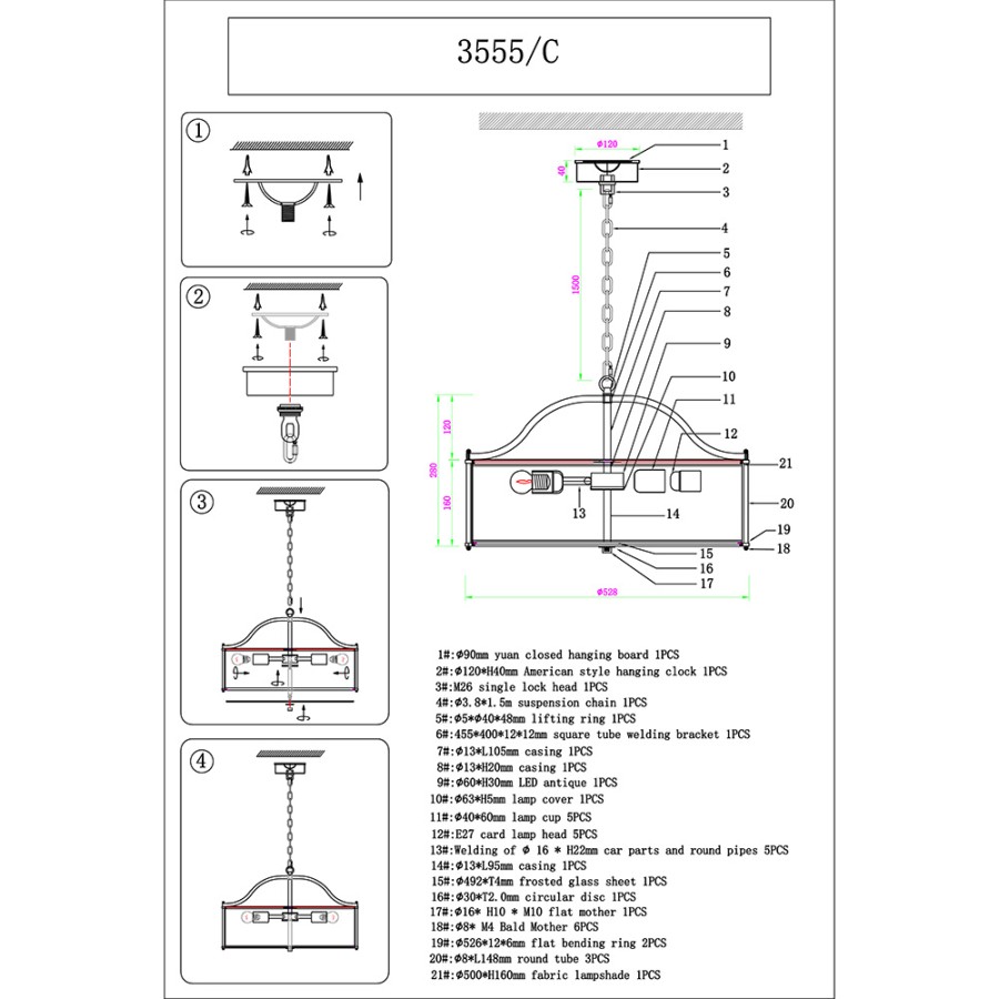 Конструкция светильника предусматривает применение 5 ламп с цоколем E14, общая мощность 200 Вт, что позволяет осветить 15 м2.