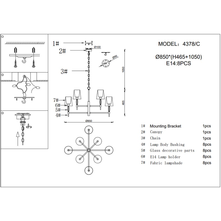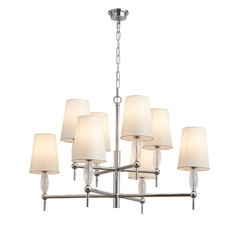 Конструкция светильника предусматривает применение 8 ламп с цоколем E14, общая мощность 320 Вт, что позволяет осветить 23 м2.