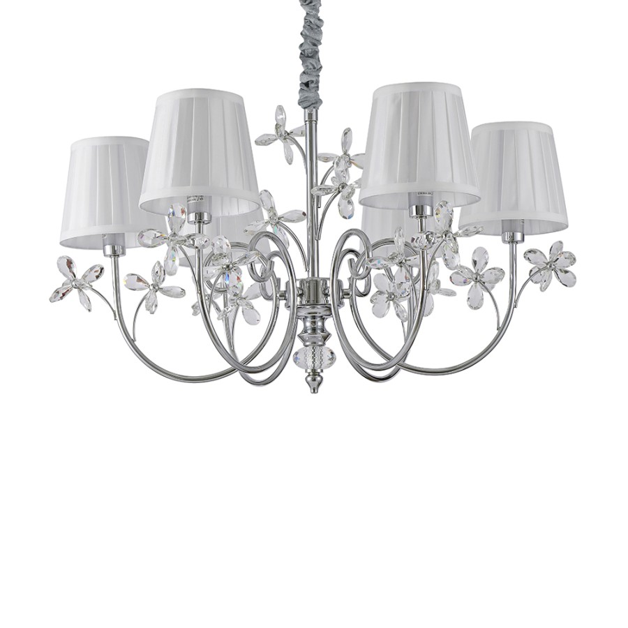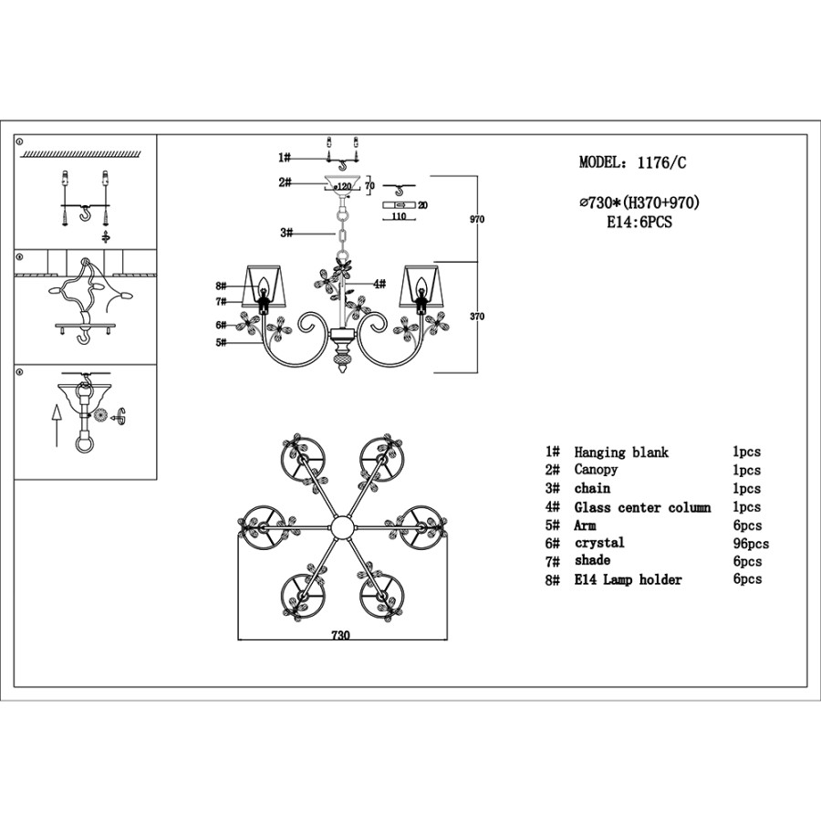 Конструкция светильника предусматривает применение 6 ламп с цоколем E14, общая мощность 360 Вт, что позволяет осветить 26 м2.