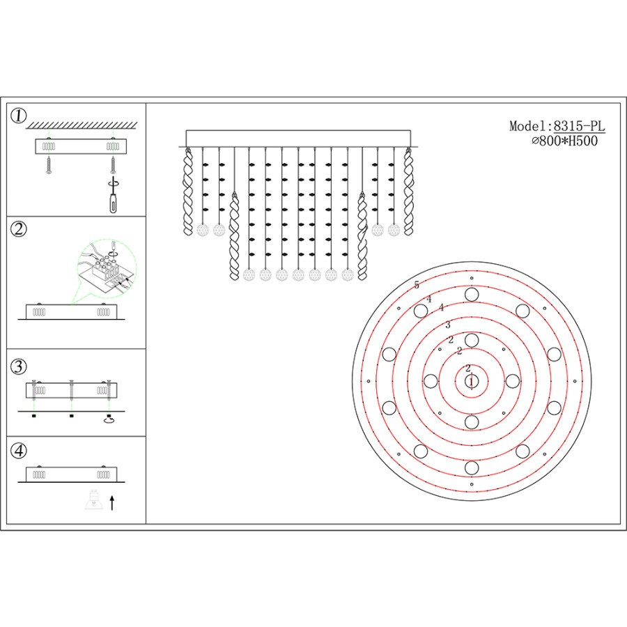 Конструкция светильника предусматривает применение 15 ламп с цоколем GU10, общая мощность 750 Вт, что позволяет осветить 35 м2.