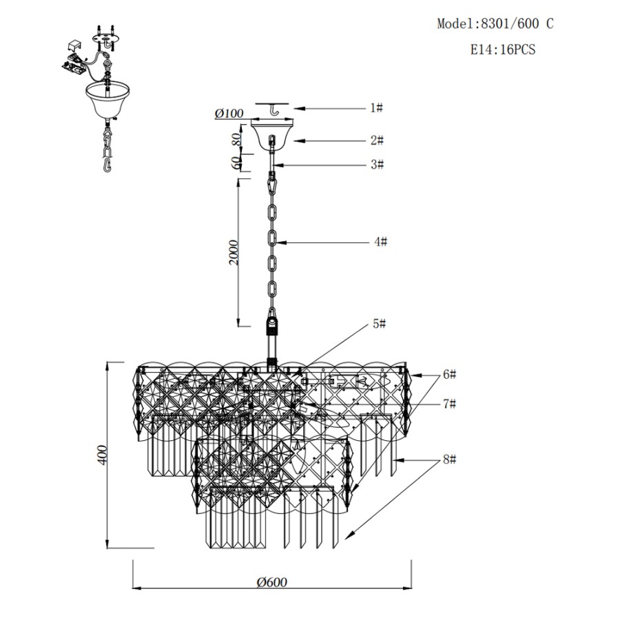 Конструкция светильника предусматривает применение 16 ламп с цоколем E14, общая мощность 640 Вт, что позволяет осветить 35 м2.