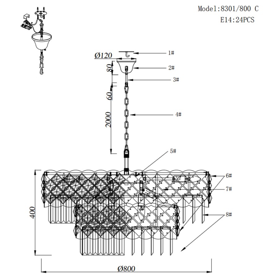 Конструкция светильника предусматривает применение 24 ламп с цоколем E14, общая мощность 960 Вт, что позволяет осветить 35 м2.