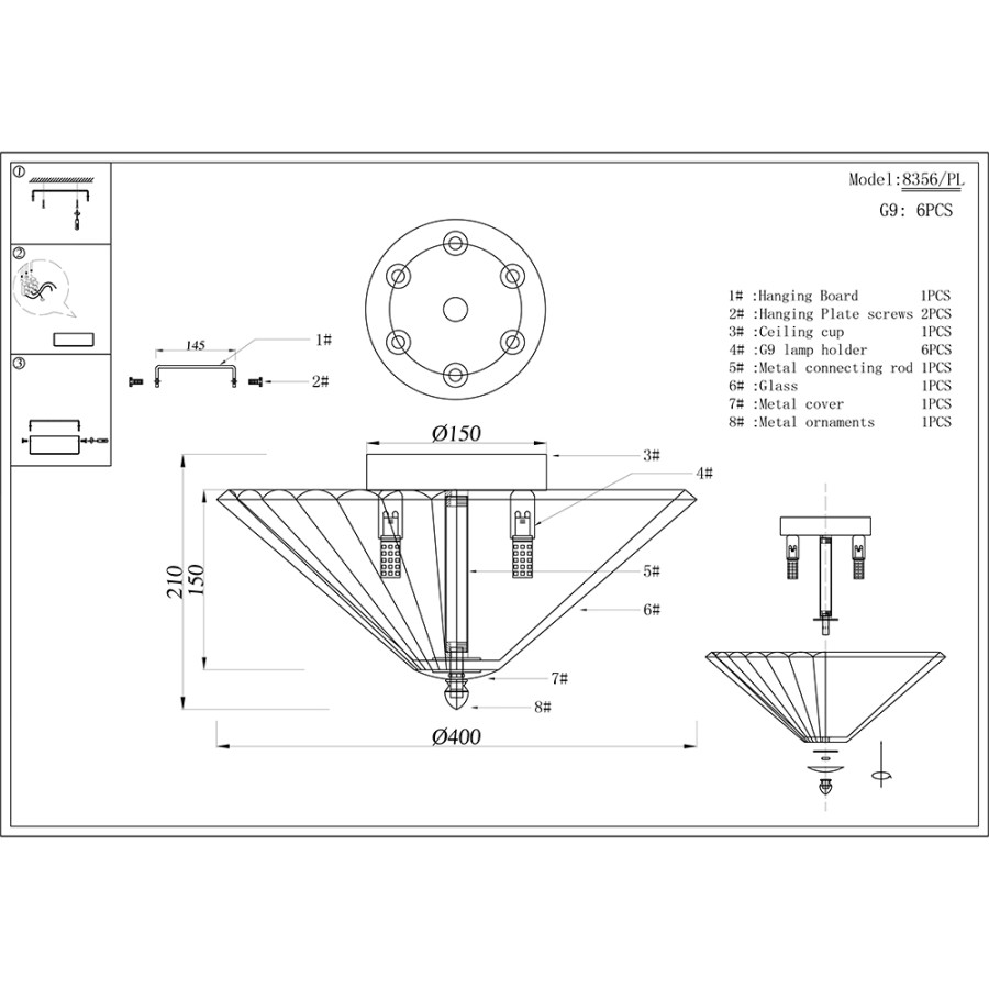 Конструкция светильника предусматривает применение 6 ламп с цоколем G9, общая мощность 240 Вт, что позволяет осветить 18 м2.