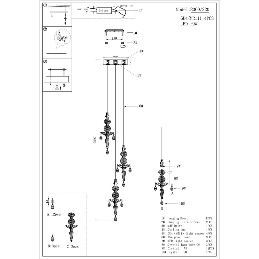 Конструкция светильника предусматривает применение 7 ламп с цоколем Встроенный источник / GU4, общая мощность 26 Вт, что позволяет осветить 12 м2.