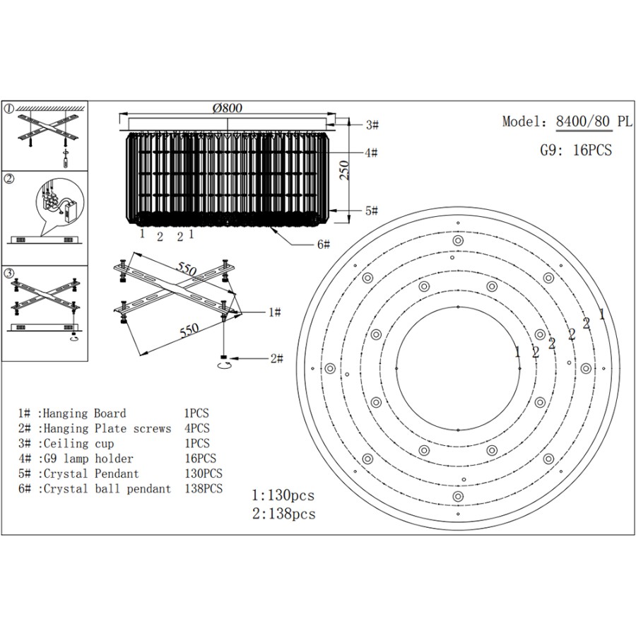 Конструкция светильника предусматривает применение 16 ламп с цоколем G9, общая мощность 640 Вт, что позволяет осветить 35 м2.
