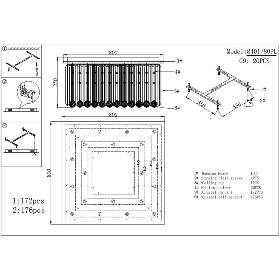 Конструкция светильника предусматривает применение 20 ламп с цоколем G9, общая мощность 800 Вт, что позволяет осветить 35 м2.
