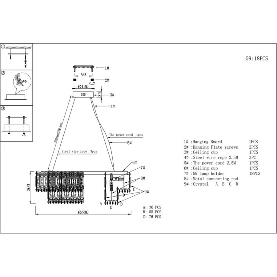 Конструкция светильника предусматривает применение 18 ламп с цоколем G9, общая мощность 720 Вт, что позволяет осветить 35 м2.