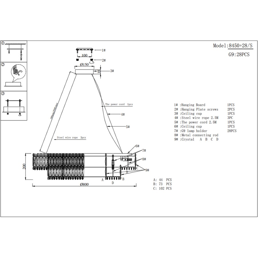 Конструкция светильника предусматривает применение 28 ламп с цоколем G9, общая мощность 1120 Вт, что позволяет осветить 35 м2.
