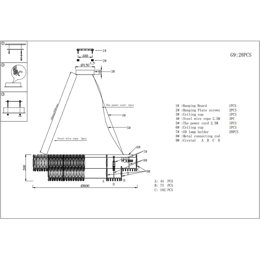Конструкция светильника предусматривает применение 28 ламп с цоколем G9, общая мощность 1120 Вт, что позволяет осветить 35 м2.