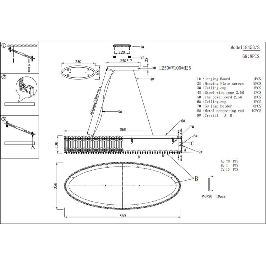 Конструкция светильника предусматривает применение 8 ламп с цоколем G9, общая мощность 480 Вт, что позволяет осветить 35 м2.