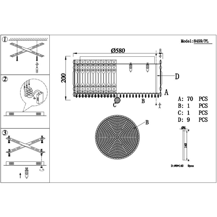 Конструкция светильника предусматривает применение 9 ламп с цоколем G9, общая мощность 540 Вт, что позволяет осветить 35 м2.