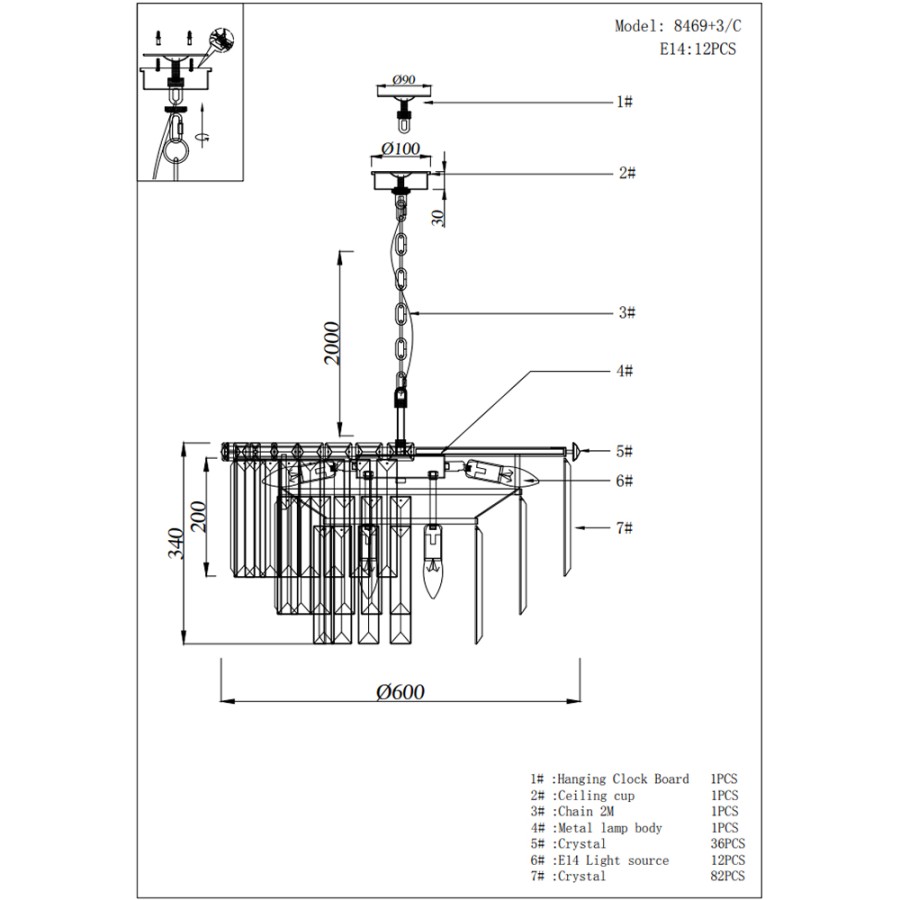 Конструкция светильника предусматривает применение 12 ламп с цоколем E14, общая мощность 480 Вт, что позволяет осветить 35 м2.