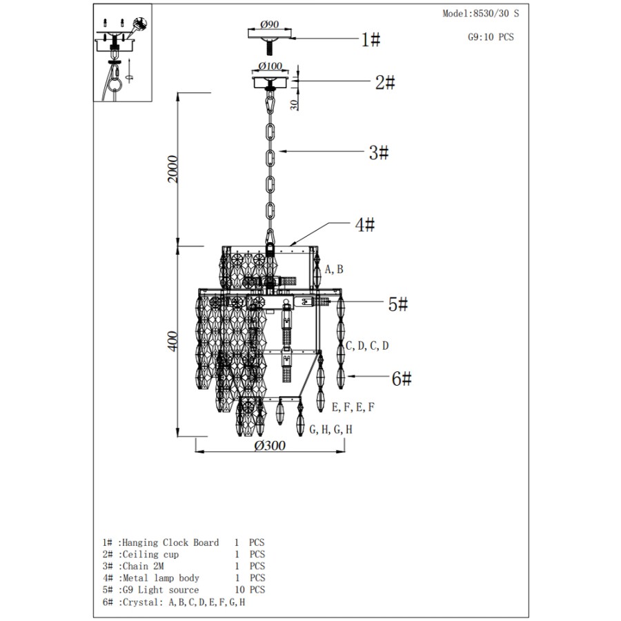Конструкция светильника предусматривает применение 10 ламп с цоколем G9, общая мощность 400 Вт, что позволяет осветить 29 м2.