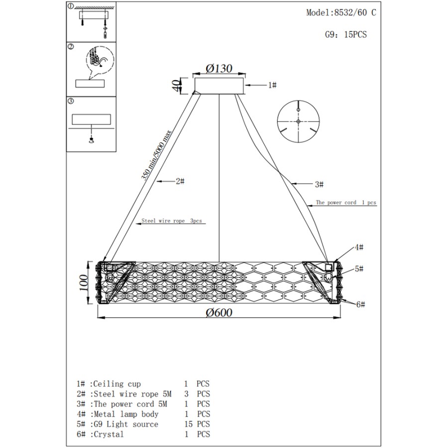 Конструкция светильника предусматривает применение 15 ламп с цоколем G9, общая мощность 375 Вт, что позволяет осветить 27 м2.
