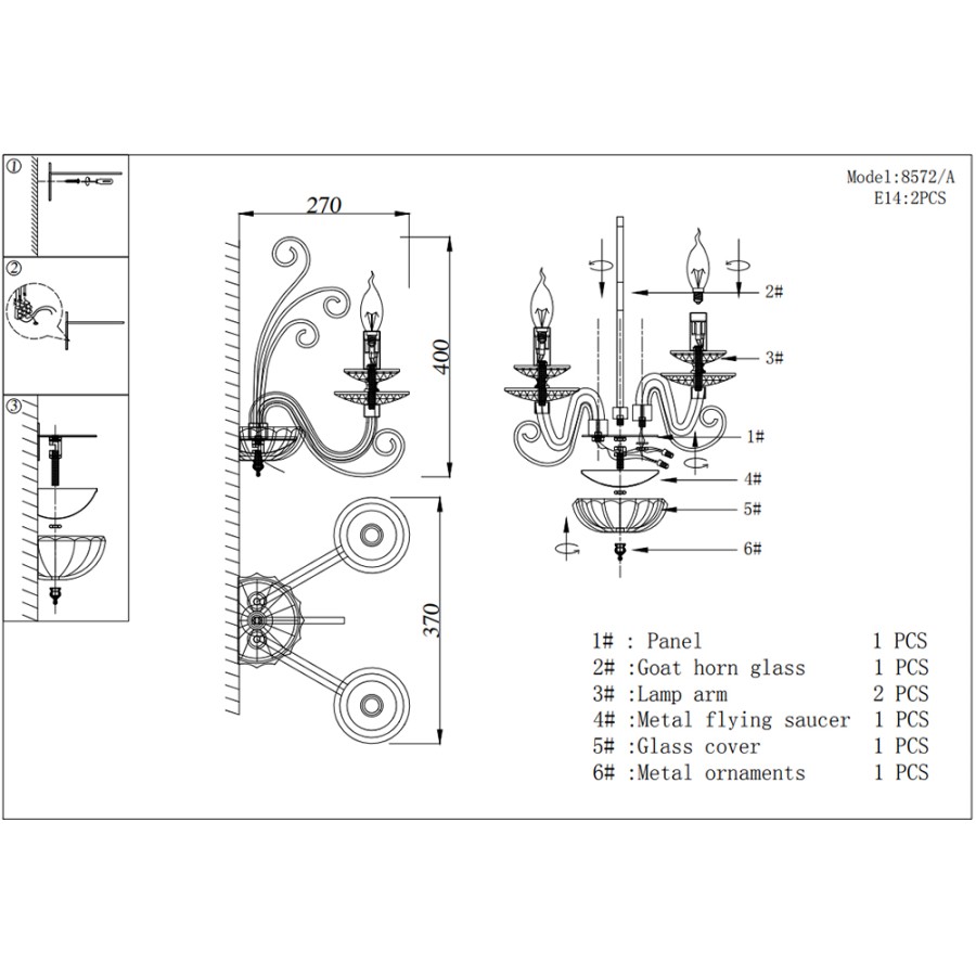 Конструкция светильника предусматривает применение 2 ламп с цоколем E14, общая мощность 80 Вт, что позволяет осветить 6 м2.