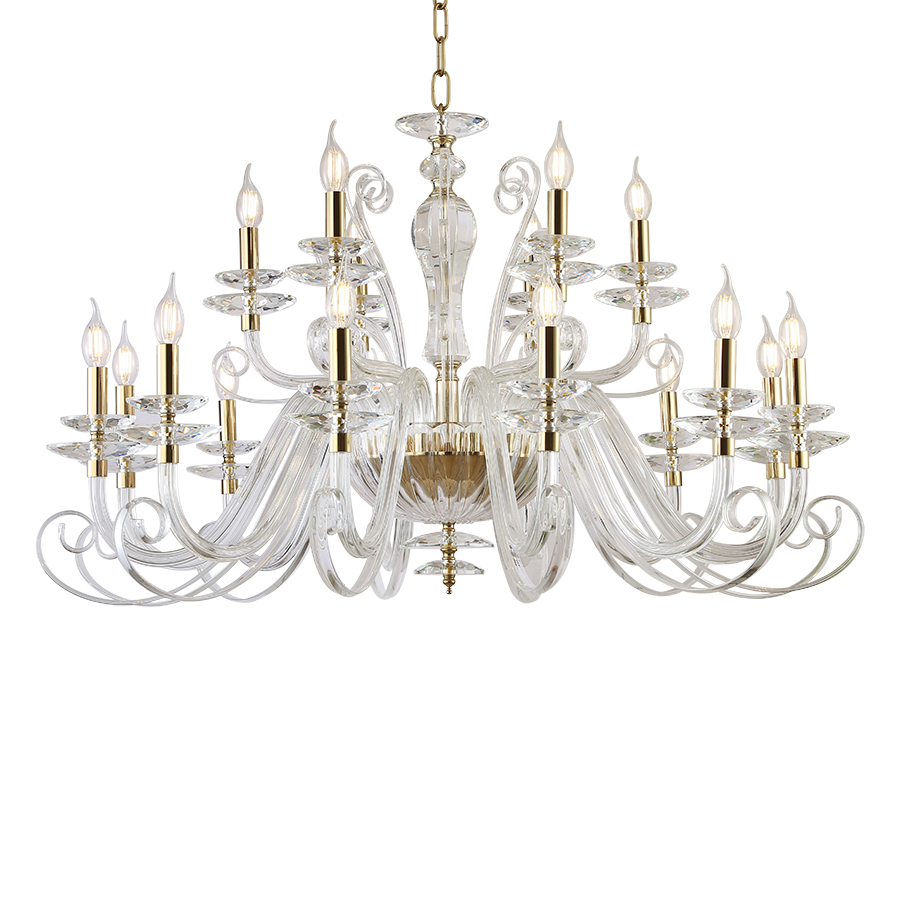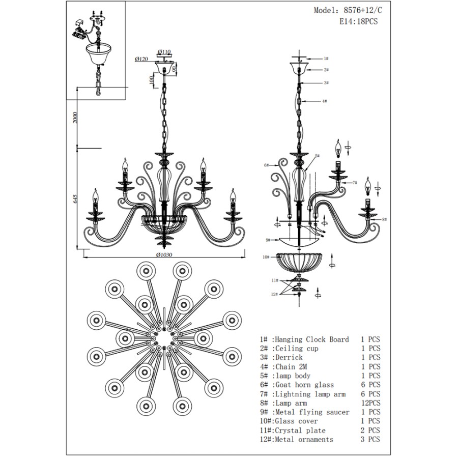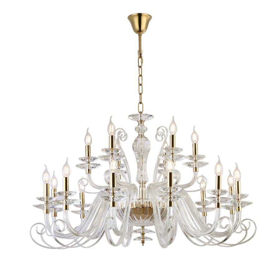 Конструкция светильника предусматривает применение 18 ламп с цоколем E14, общая мощность 720 Вт, что позволяет осветить 35 м2.