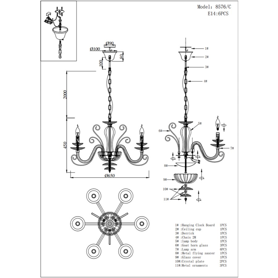 Конструкция светильника предусматривает применение 6 ламп с цоколем E14, общая мощность 240 Вт, что позволяет осветить 18 м2.