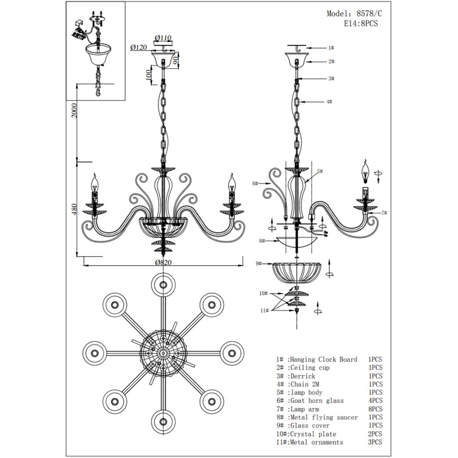 Конструкция светильника предусматривает применение 8 ламп с цоколем E14, общая мощность 320 Вт, что позволяет осветить 23 м2.