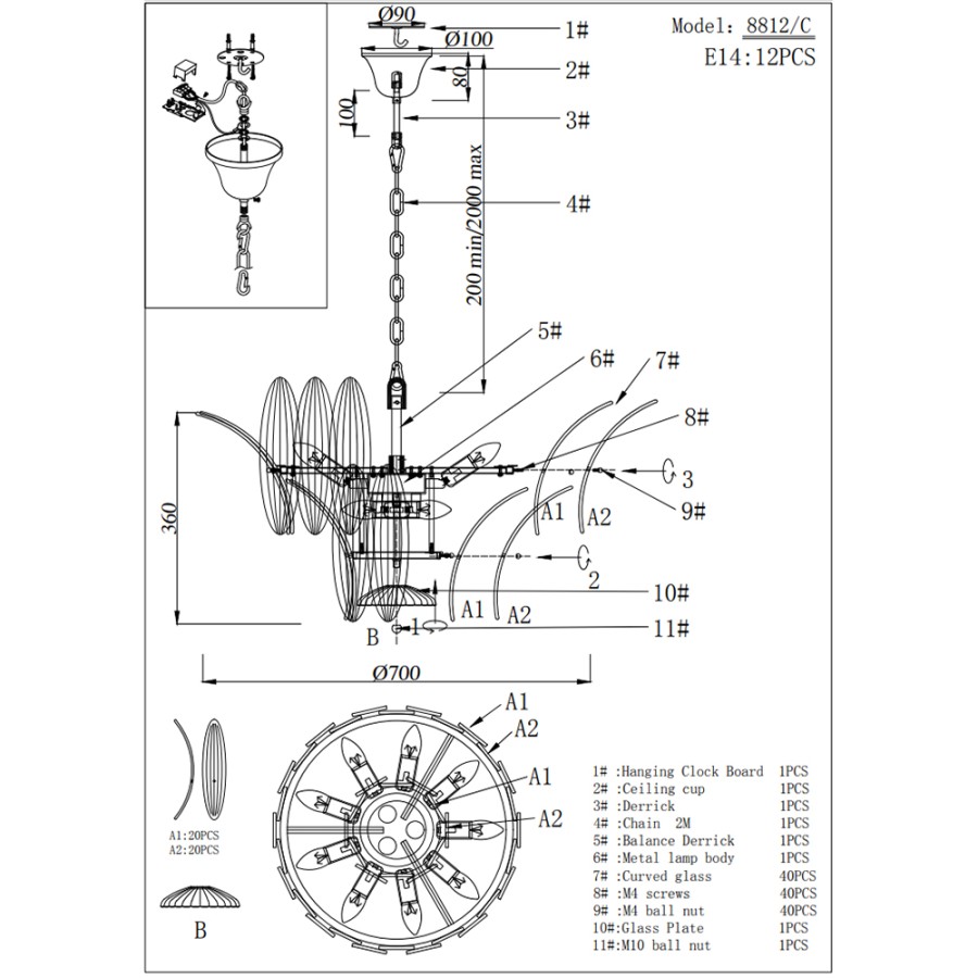 Конструкция светильника предусматривает применение 12 ламп с цоколем E14, общая мощность 720 Вт, что позволяет осветить 35 м2.
