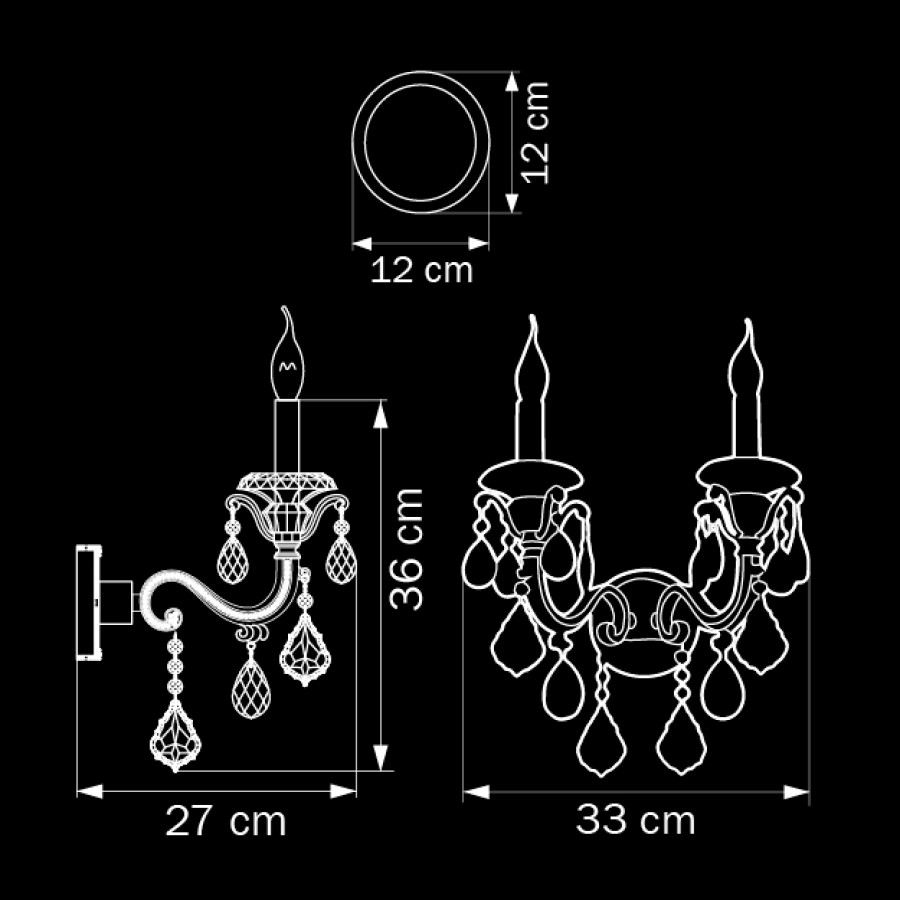 Конструкция светильника предусматривает применение 2 ламп с цоколем E14, общая мощность 120 Вт, что позволяет осветить 9 м2.
